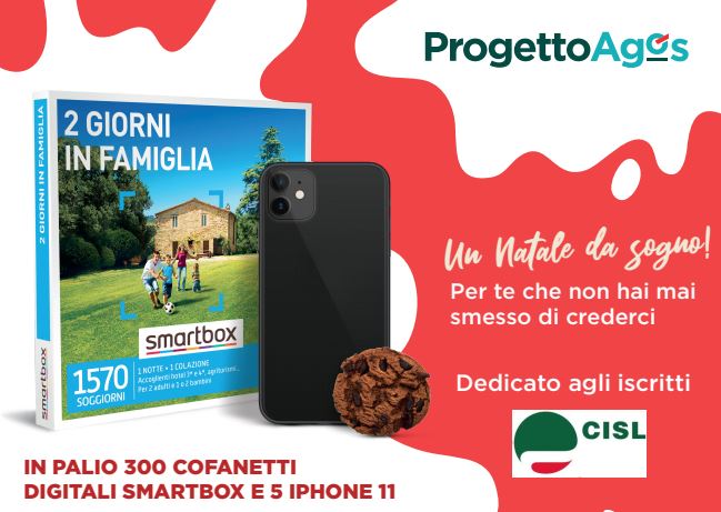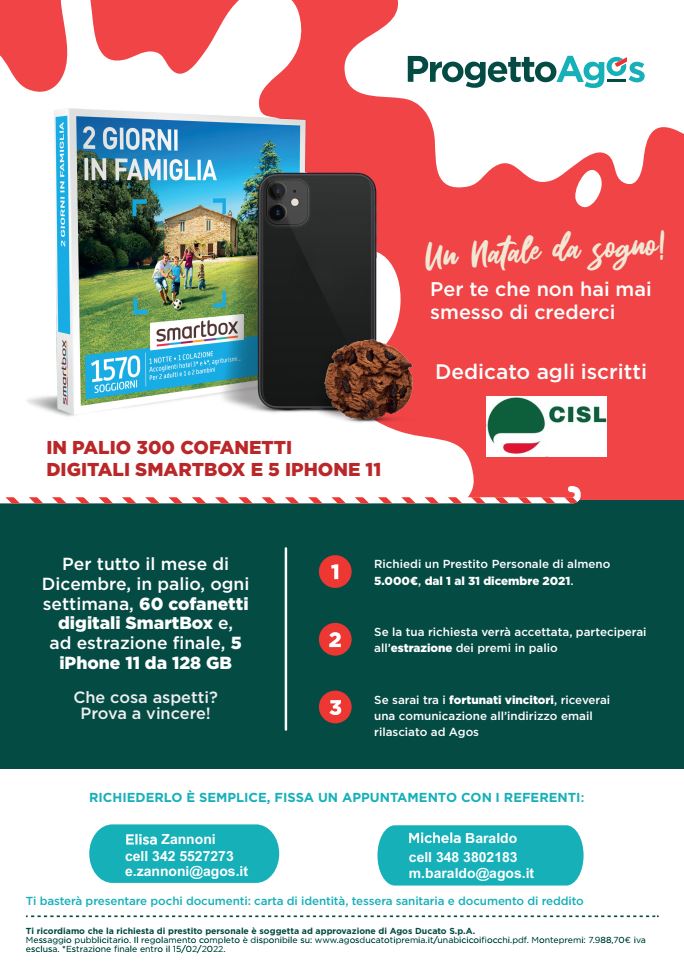 Se richiedi un prestito di almeno 5.000€ entro il 31 dicembre ( e ovviamente puoi ottenere le condizioni riservate agli iscritti CISL) puoi partecipare al nuovissimo concorso "UN NATALE DA SOGNO" di AGOS, che mette in palio ben 300 cofanetti "Smart Box" e 5 iPhone 11. Qui sotto tutti i dettagli: