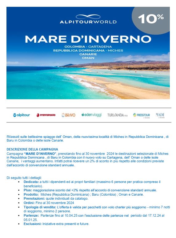 La nostra convenzionata ALPITOUR lancia una promozione speciale dedicata a chi vuole andare al mare anche in inverno: sino al 30/11/24 puoi infatti prenotare le destinazioni di Miches in Repubblica Dominicana , di Baru in Colombia con il nuovo volo su Cartagena, dell’ Oman o delle isole Canarie: per queste destinazioni potrai avere uno sconto extra del 2% oltre alle condizioni standard previste dalla nostra convenzione (si può quindi arrivare ad uno sconto del 12% sul prezzo da catalogo, a seconda dell'anticipo con cui si prenota).