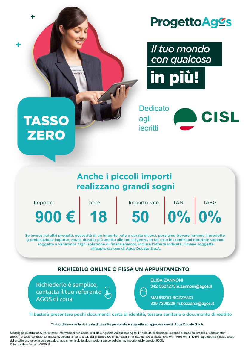Ma affrettati: la promozione "Tasso Zero" SCADE IL 30 GIUGNO 2022! Puoi richedere il prestito (o informazioni ulteriori) contattando i nostri referenti per la convenzione CISL: Elisa ZANNONI (342 5527273 - email: e.zannoni@agos.it) oppure Maurizio BOZZANO (335 7208228 - email: m.bozzano@agos.it).
