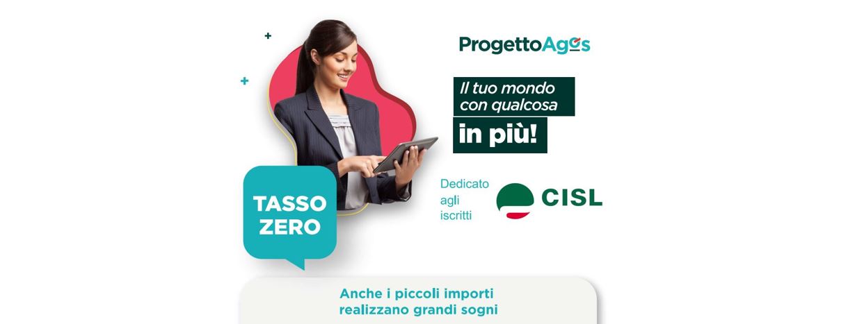 La nostra convenzionata AGOS ha lanciato una promozione speciale riservata agli iscritti CISL: puoi ottenere subito 900 euro, rimborsabili in 18 rate da € 50 A TASSO ZERO (TAN e TAEG 0%). Anche con un piccolo importo si può realizzare dunque un desiderio, magari accantonato da tempo: quel viaggio tanto desiderato, il nuovo tv, l'abito elegante per una ricorrenza o l'arredamento da completare o rinnovare....