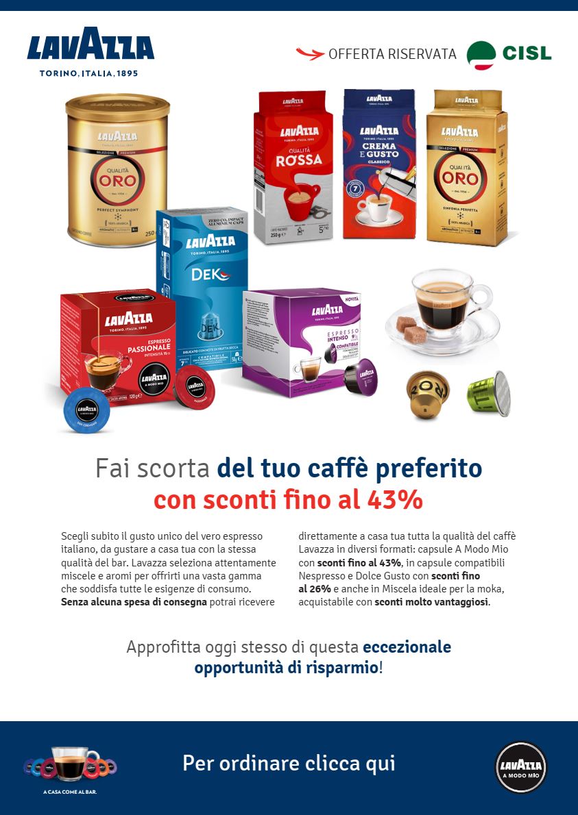 La nostra convenzionata LAVAZZA ha prorogato sino al 20 Novembre la speciale promozione, valida per i tesserati CISL che faranno un ordine dal link sotto riportato ( e salvo esaurimento scorte).