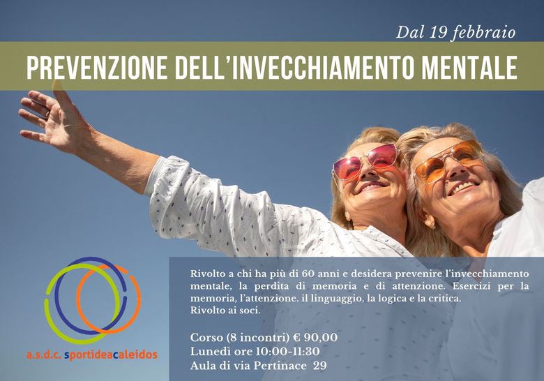La Dottoressa DEBORAH RASTIELLO, psicologa specializzata in psicoterapia individuale e di gruppo ad orientamento psicodinamico (e convenzionata CISL), organizza un corso di prevenzione dell'invecchiamento mentale, rivolto a chi ha più di 60 anni e desidera prevenire l'invecchiamento mentale, la perdita di memoria e di attenzione. Si acquisiranno più informazioni su come cambia la mente umana e si impareranno alcune strategie per esercitare in modo divertente le varie funzioni cognitive: memoria, attenzione, linguaggio, logica e critica. Il corso è strutturato in 8 incontri, a partire da lunedì 19 febbraio (ore 10-11.30), e si svolgerà presso Sportidea Caleidos, in via Pertinace 29 a Torino (zona Piazza Pitagora) . Il costo del corso è di € 90.