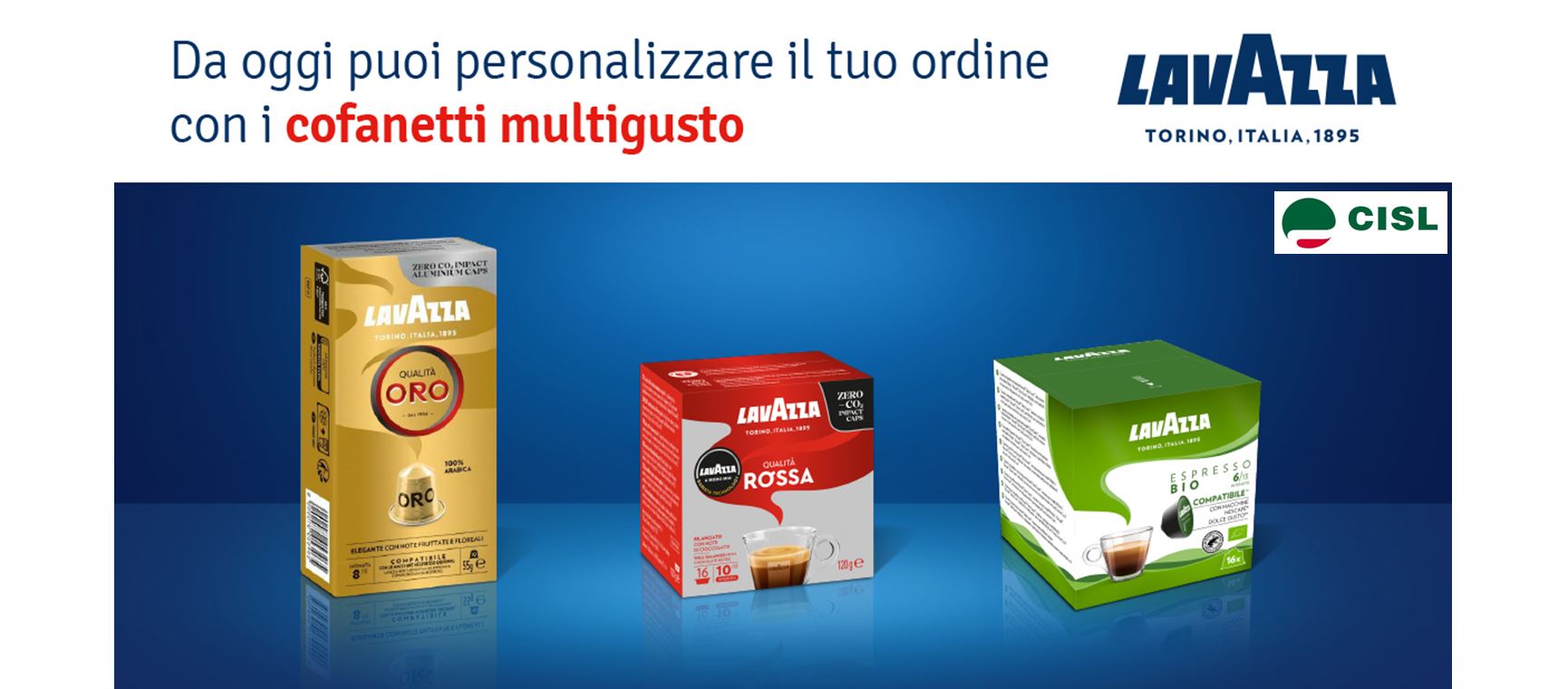 Da oggi l'offerta dei prodotti LAVAZZA in convenzione per gli iscritti CISL si arricchisce: sono infatti disponibili i nuovi cofanetti multigusto: potete quindi preparare un ordine online con un "mix" di diverse capsule, scegliendo le singole confezioni del caffè. In questo modo è anche più facile risparmiare, perché si può condividere l'ordine con colleghi, amici e parenti senza la necessità di ordinare un solo gusto di caffè uguale per tutti.