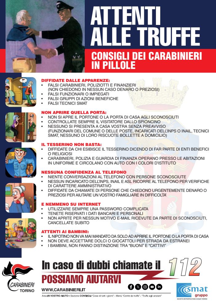 In considerazione del fatto che sempre più spesso viene segnalata la presenza di persone che, qualificandosi come tecnici SMAT, chiedono agli Utenti di entrare nelle abitazioni, SMAT ed il Comando Provinciale Carabinieri di Torino hanno definito una serie di azioni divulgative e di sensibilizzazione per invitare l’utenza a prestare attenzione e a diffidare da coloro che si presentano presso le abitazioni dichiarando di dover riscuotere dei pagamenti della bolletta, effettuare dei controlli sull’acqua e/o interventi tecnici presso la singola abitazione, dandone tempestiva comunicazione alle forze dell’ordine.