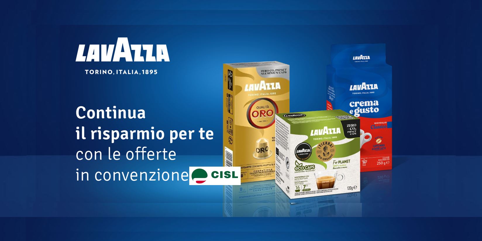 LAVAZZA ha rinnovato anche per il 2026 la convenzione riservata agli iscritti CISL per l'acquisto a prezzo agevolato di capsule " A Modo Mio", caffè in grani e macinato, macchine espresso.