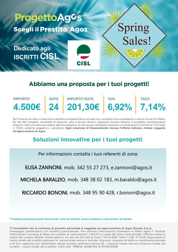 AGOS ha predisposto una nuova offerta "primaverile" riservata agli iscritti CISL, valida sino al 31 Maggio 2026: se hai necessità di un prestito, è possibile richiedere sino a € 4.500, rimborsabili in 24 rate da € 201,30 (TAN 6,92% - TAEG 7,14%).